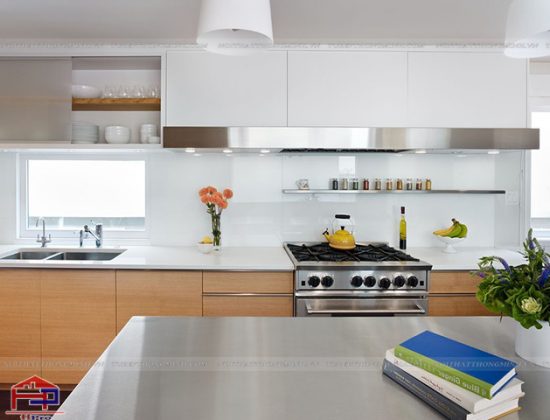 Hiện nay kính màu cường lực đang được sử dụng phổ biến nhất cho phần ốp bếp bởi những ưu điểm vượt trội của nó.